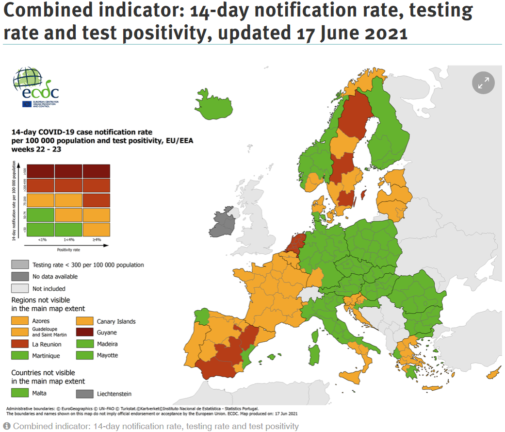 Per monitorare l'andamento della pandemia il Centro europeo per la prevenzione e il controllo delle malattie (Ecdc) pubblica periodicamente mappe basate sui dati comunicati dagli Stati membri in ottemperanza alla raccomandazione del Consiglio dell'Ue del 13 ottobre 2020, come modificata dalla raccomandazione del Consiglio del 28 gennaio 2021 e dalla raccomandazione (UE) 2021/961 del Consiglio, del 14 giugno 2021 (l'ultimo aggiornamento è del 17 giugno 2021). L'Ecdc pubblica inoltre statistiche quotidiane sui contagi e sui decessi nel mondo, nell'Ue, nello Spazio economico europeo (See) e nel Regno Unito.