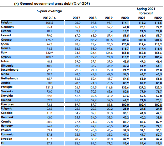 Per quanto concerne il deficit pubblico, la Commissione prevede un aumento per l’Eurozona dal 7,2% del PIL nel 2020 all’8% del PIL nel 2021, per poi calare al 3,8% del PIL nel 2022, mentre per l’UE27 un aumento dal 6,9% del PIL nel 2020 al 7,5% del PIL nel 2021, per poi scendere al 3,7% del PIL nel 2022. Per l'Italia, una crescita dal 9,5% del PIL nel 2020 all’11,7% nel 2021, per poi diminuire al 5,8% nel 2022.