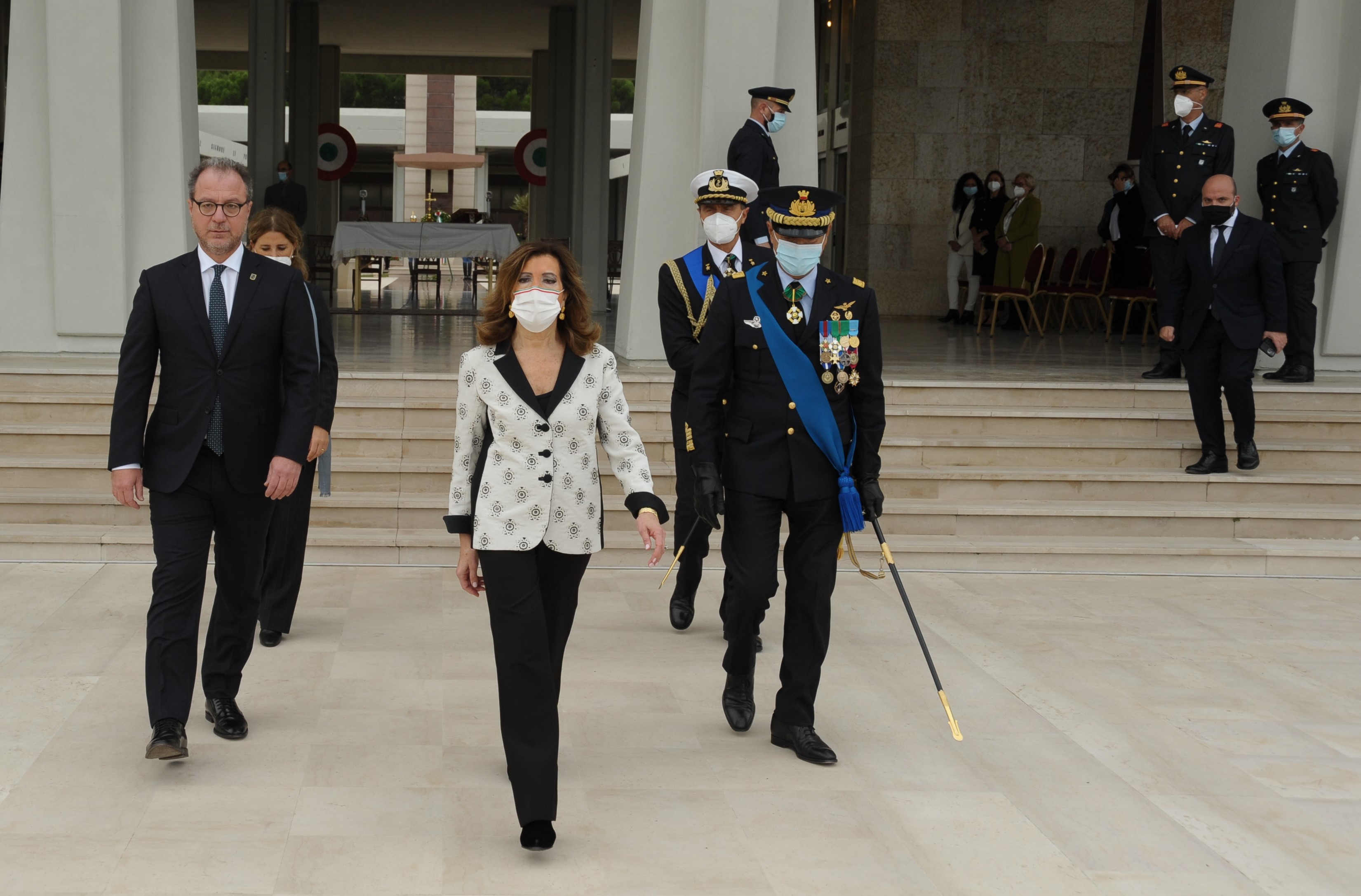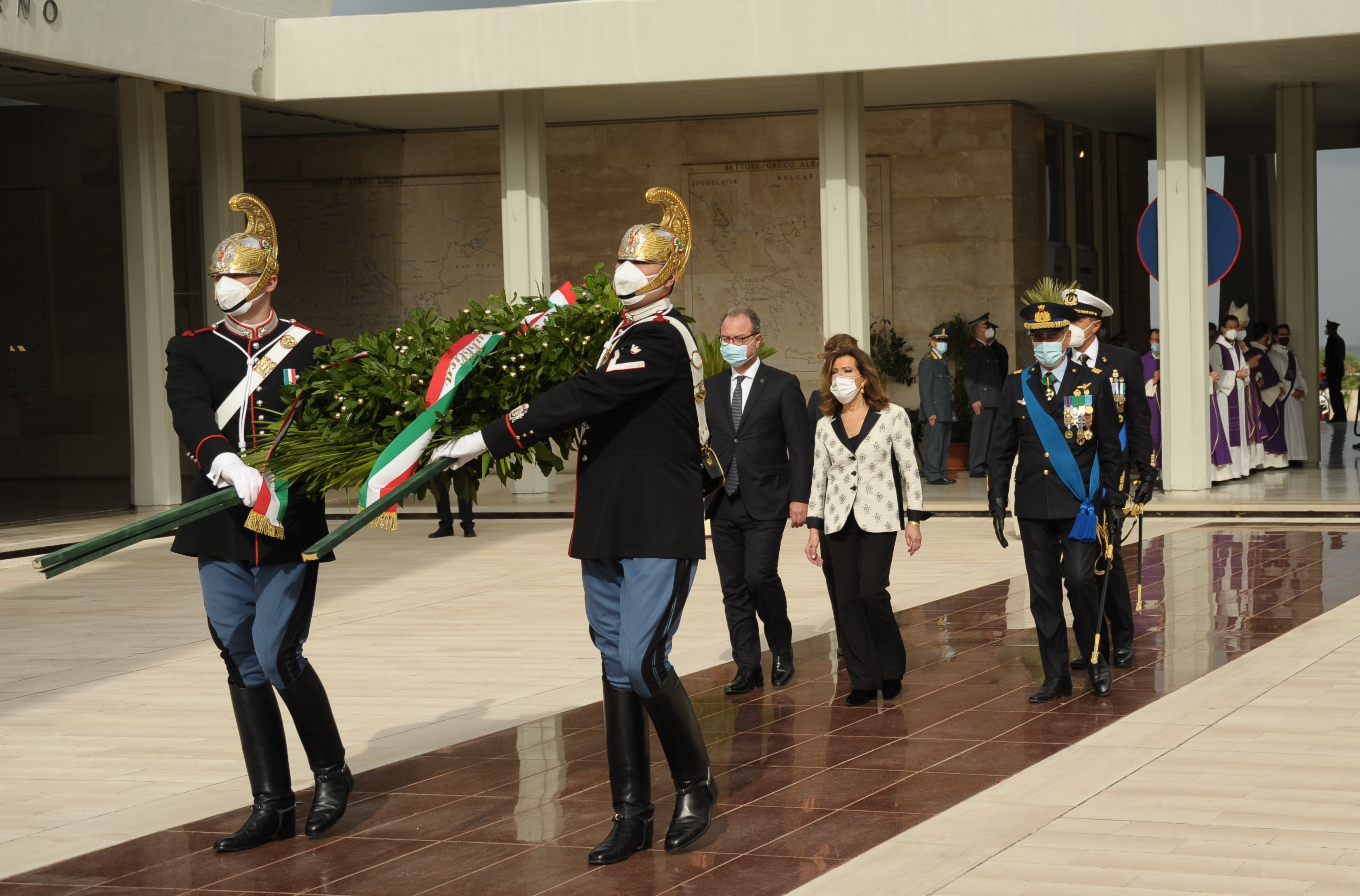 Sacrario Militare dei Caduti d'Oltremare di Bari. Il Presidente del Senato, Maria Elisabetta Alberti Casellati, depone la corona d'alloro del Presidente della Repubblica, sorretta da due Corazzieri, sul Sacello dei Caduti d'Oltremare.