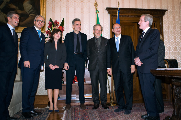 Il Presidente Schifani con il senatore Carlo Vizzini, durante l'incontro con il regista del film Lincoln, Steven Spielberg, e gli attori protagonisti Sally Field e Daniel Day-Lewis.