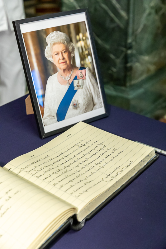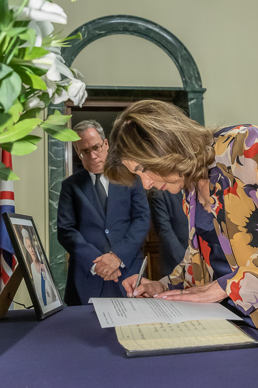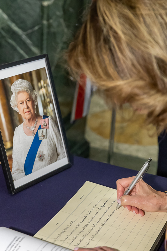 Il Presidente del Senato, Maria Elisabetta Alberti Casellati, firma il libro delle condoglianze per la scomparsa di Sua Maestà la Regina Elisabetta II.