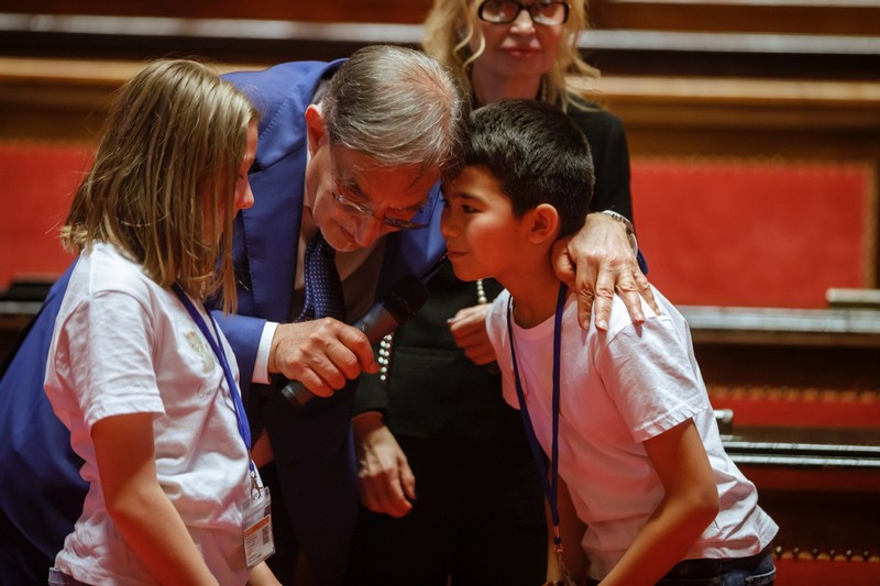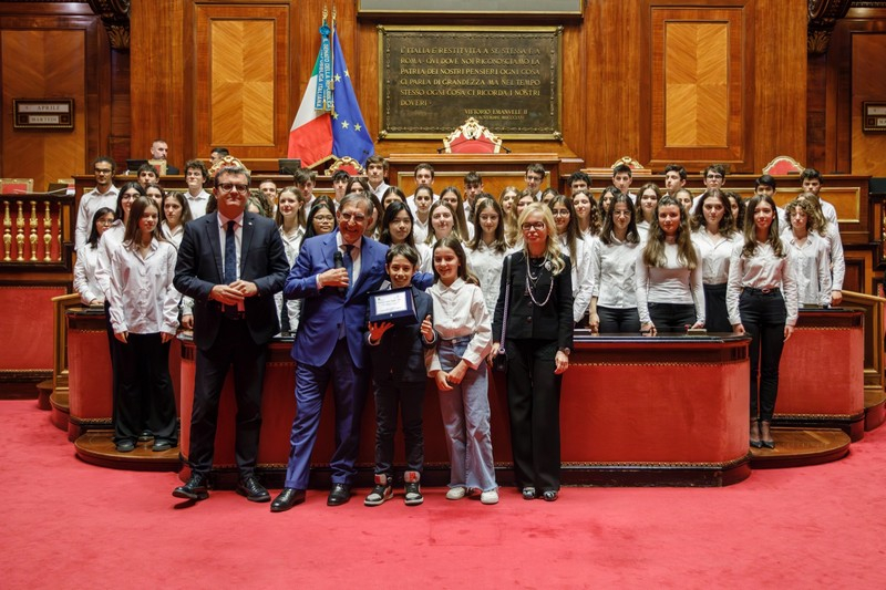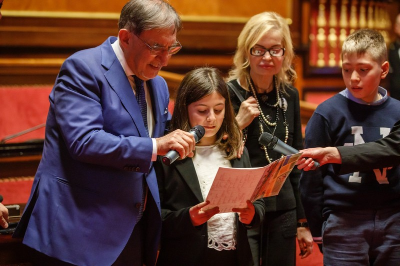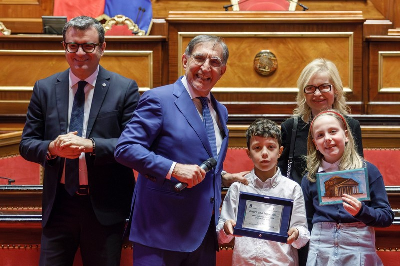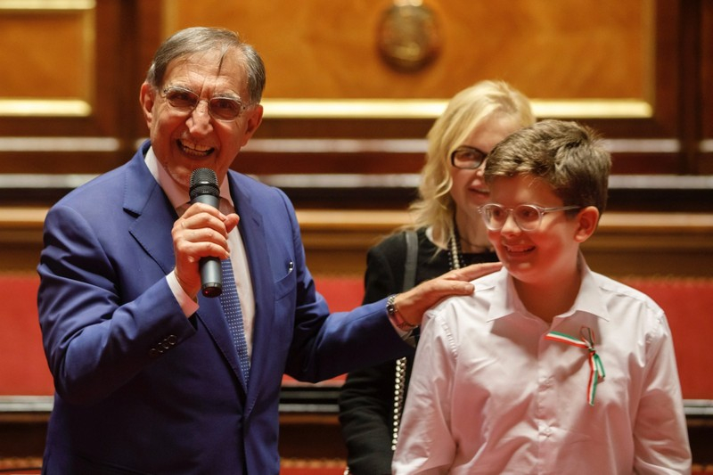 - Il Presidente del Senato Ignazio La Russa, con il Vice Presidente Gian Marco Centinaio e il Segretario Generale, nell'Aula di Palazzo Madama alla cerimonia di premiazione dell'iniziativa “Vorrei una legge che...”, concorso rivolto alla quinta classe della scuola primaria promosso in collaborazione con il Ministero dell'Istruzione