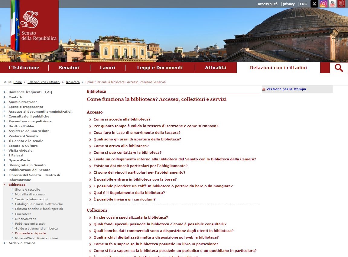 Nata per rispondere ai quesiti degli utenti circa il funzionamento della biblioteca, la pagina delle Domande e risposte struttura i propri contenuti in tre macro sezioni tematiche: "Accesso", "Collezioni" e "Servizi". Si è intervenuti innanzitutto sulle domande, delle quali è stata attuata una riorganizzazione volta a garantire agli utenti una più agile individuazione delle informazioni desiderate. Non solo infatti alcuni dei quesiti sono stati ricollocati tra le tre sezioni tematiche, in migliore accordo con il tema trattato, ma è stato anche diminuito il loro numero. Allo scopo di una razionalizzazione e migliore ricercabilità, molti quesiti specifici sono stati infatti accorpati sotto un'unica domanda più generale: ad esempio, le domande «Si possono prendere i libri in consultazione?»; «Ci sono orari per la distribuzione dei libri in consultazione?» e «Quanti volumi si possono richiedere e avere in consultazione?» sono state sostituite da «Come si richiede un libro in consultazione?». Inoltre, nell'ottica di garantire una migliore esperienza di navigazione nel sito tutto, le risposte fornite sono state rimodulate in modo tale sia da fornire agli utenti informazioni sintetiche, sia da indirizzarli verso le pagine del sito dedicate alla tematica richiesta per ulteriori approfondimenti. La pagina Domande e risposte viene così a fungere quasi da 'bussola' per la navigazione tra le diverse parti del sito, garantendo l'accesso a informazioni sempre aggiornate e scongiurando il rischio di una precoce obsolescenza della pagina stessa.