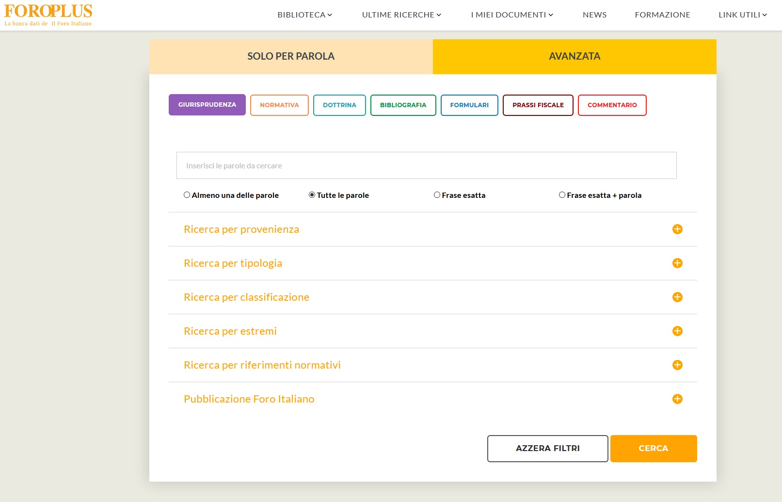 La ricerca solo per parola può riguardare un singolo archivio o tutti quelli disponibili e permette nello stesso tempo di selezionare eventualmente l'ambito tra le voci classificatorie del Repertorio e del "Foro Italiano".
