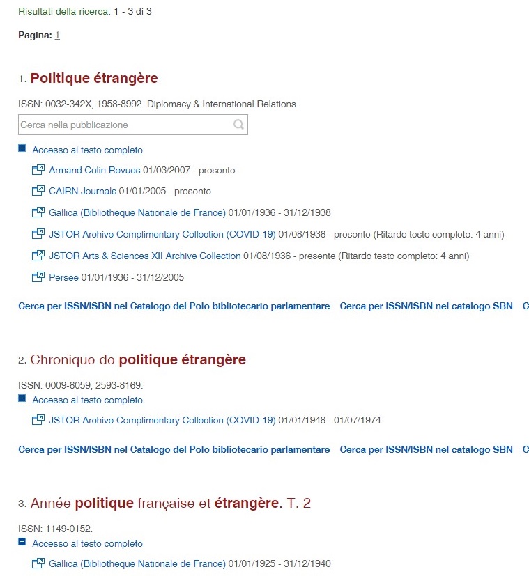 Per ciascuno dei titoli di periodici è stata controllata l'esistenza in internet di una versione online dei fascicoli disponibili in open access e delimitato il relativo periodo temporale di copertura. Ad esempio, la rivista "Politique étrangère" potrà essere consultata sia sulle banche dati che la biblioteca compra in abbonamento (Cairn, Jstor, ecc.), sia su Gallica o Persée, banche dati francesi open access.