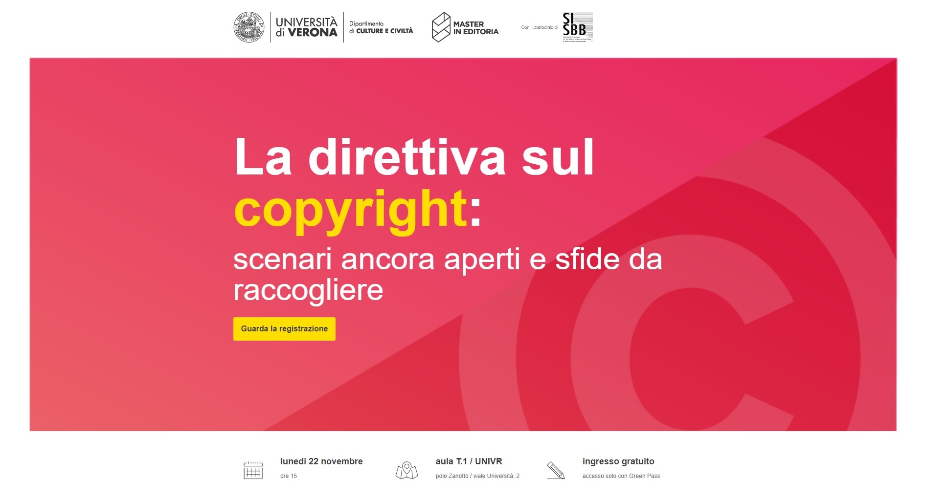 Lo scorso 22 novembre, nell'ambito del Master in editoria attivo presso il Dipartimento di culture e civiltà dell'Università di Verona, si è svolto il primo incontro di studi successivo al Decreto legislativo 8 novembre 2021 n. 177 che ha dato attuazione alla Direttiva europea sul Copyright, sul diritto d'autore e sui diritti connessi nel mercato unico digitale (2019/790) del 17 aprile 2019 (G.U. Serie generale n. 28 del 27 novembre 2021).