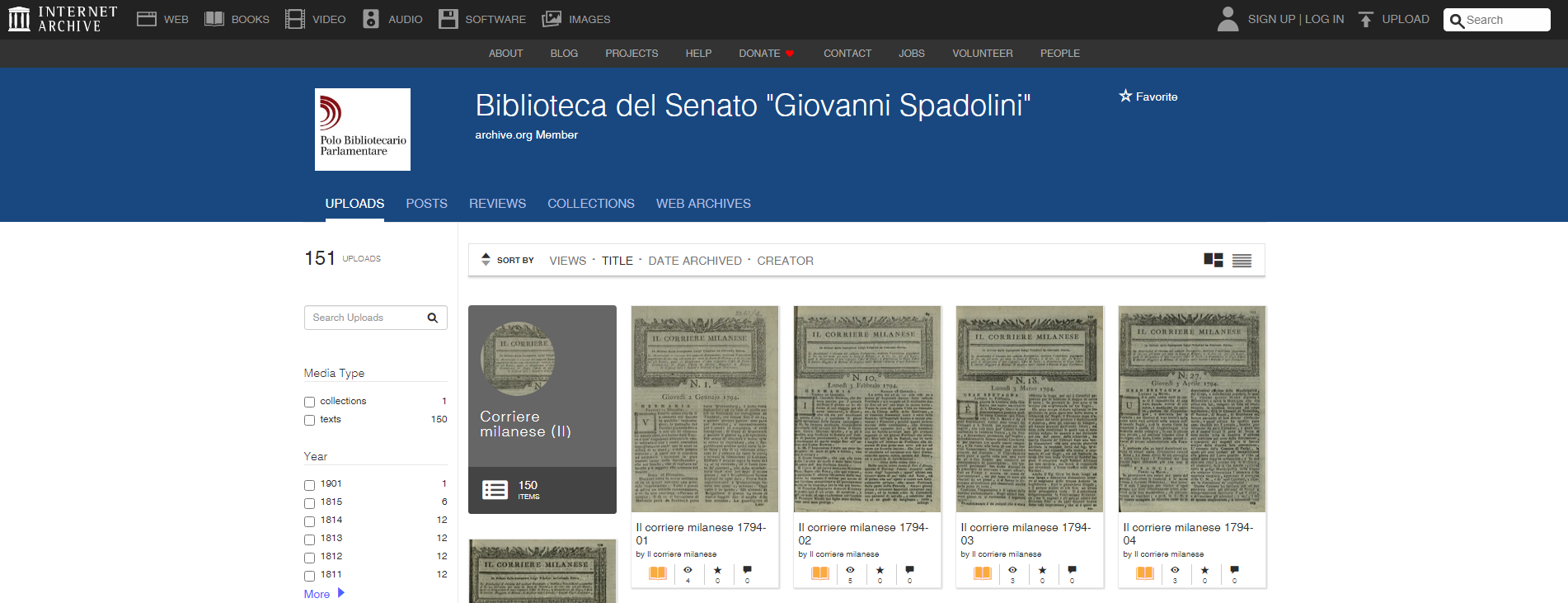 La scelta di molte biblioteche e istituzioni presenti su Internet Archive è stata quella di creare un'unica collezione, coincidente col nome stesso della biblioteca, entro cui far confluire l'insieme del materiale caricato. Al momento la Biblioteca del Senato ha scelto una strada diversa nel tentativo di organizzare in modo più strutturato e parlante le proprie collezioni. A partire da settembre verrà avviata una seconda tranche di caricamenti che riguarderà altre testate storiche, quasi certamente appartenenti alla collezione GiSID. Il lancio di sempre più giornali digitalizzati su Internet Archive consentirà di sperimentare l'utilizzabilità della struttura per collezioni secondo i criteri sopra descritti, non escludendo, per il futuro, eventuali aggiustamenti o ripensamenti strutturali.
