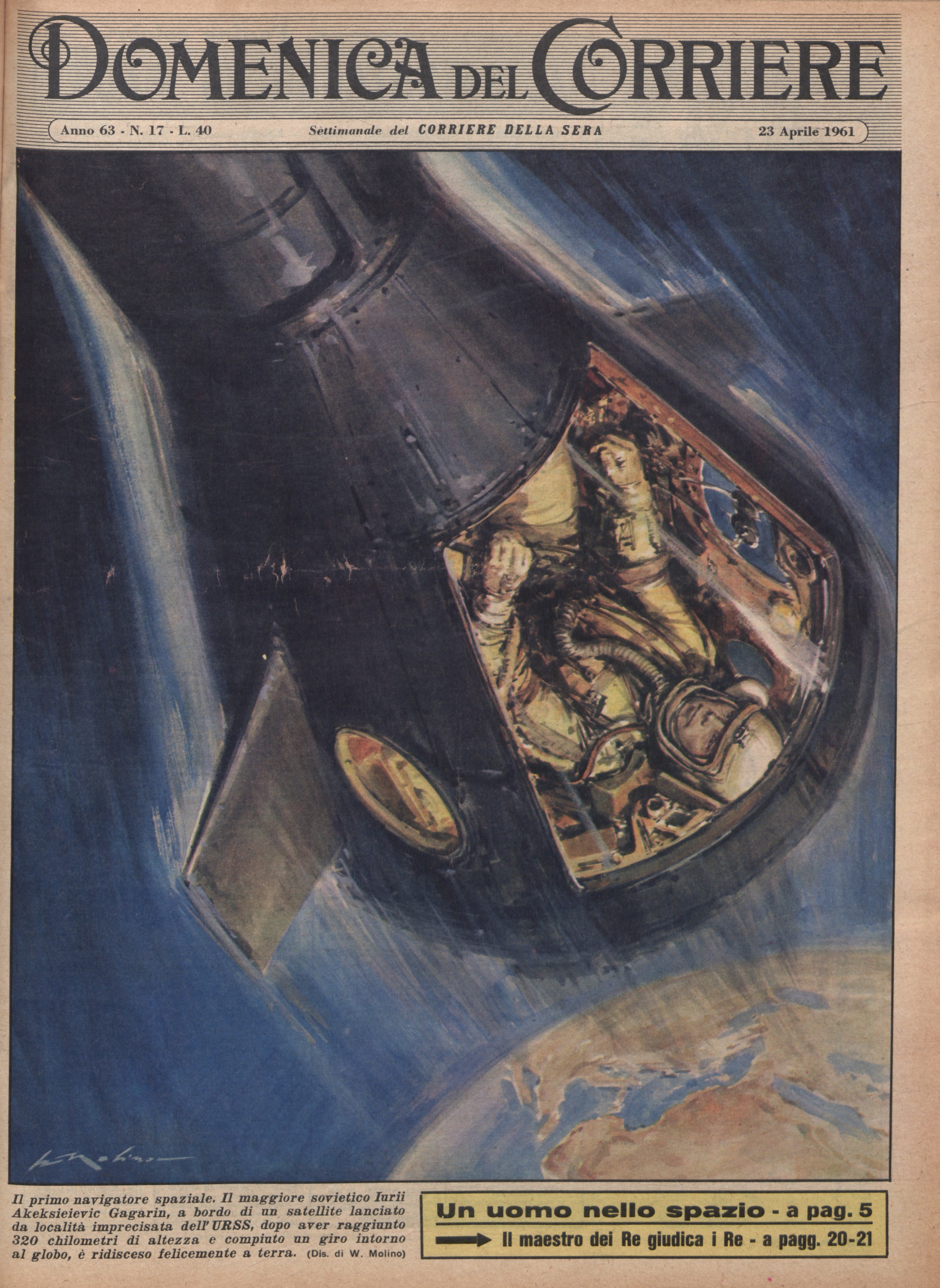 Tra il 12 e il 13 aprile 1961 i giornali di tutto il mondo riportano la notizia del primo volo umano nello spazio: il maggiore sovietico Yuri Gagarin è il primo cosmonauta, a bordo della navicella Vostok. La notizia viene data il 12 aprile dalla radio russa tramite i dispacci ufficiali della Tass: «le informazioni tecniche sono poche, ma in compenso abbondano la retorica, la propaganda e le indicazioni delle frequenze sulle quali si può agganciare la voce del cosmonauta durante le sue comunicazioni con le stazioni di controllo a terra» (Paolo Magionami, Gli anni della Luna. 1950-1972: l'epoca d'oro della corsa allo spazio. Milano, Springer-Verlang Italia, 2009, p. 62).