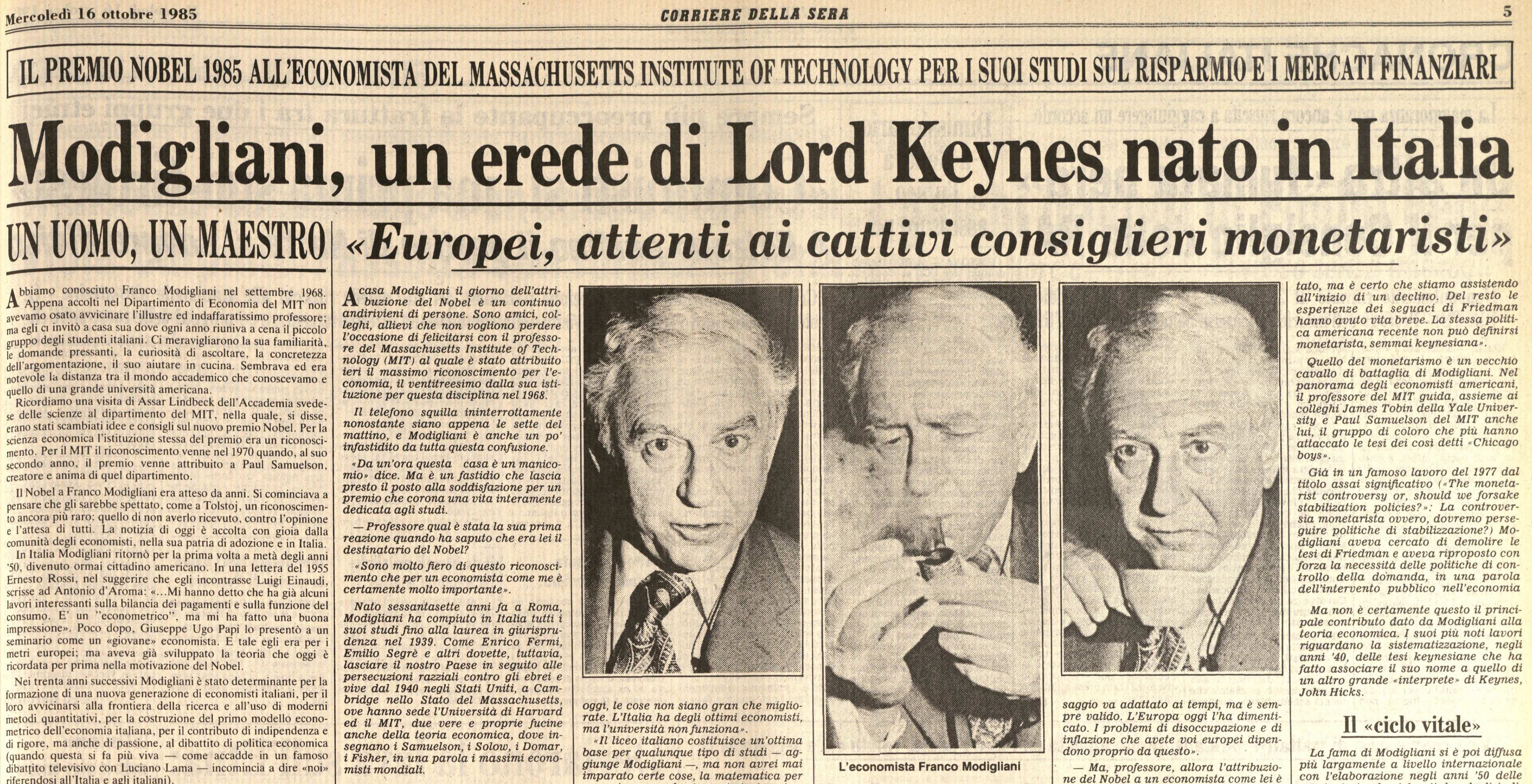 Marco Cecchini, Modigliani, un erede di Lord Keynes nato in Italia. "Europei, attenti ai cattivi consiglieri monetaristi", "Corriere della sera", 16 ottobre 1985, p. 5.