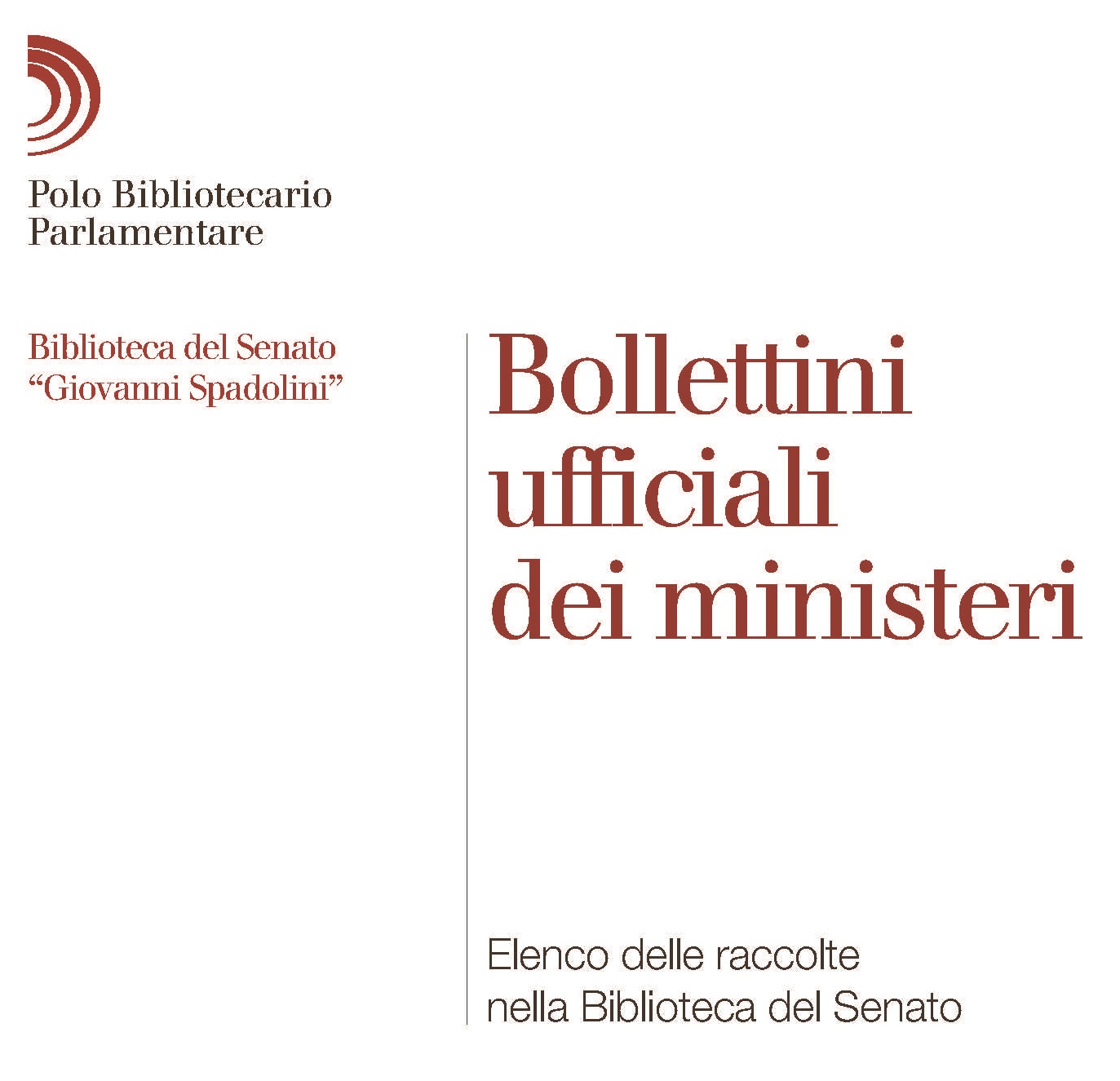 Per questi motivi la Biblioteca del Senato - sempre attenta alla valorizzazione della documentazione di fonte pubblica e normativa, che talvolta confluisce in fondi speciali (pensiamo ad esempio ai fondi di diritto comune o di legislazione degli Stati preunitari) - ha pensato di evidenziare in un apposito prospetto dal titolo Bollettini ufficiali dei ministeri. Elenco delle raccolte nella Biblioteca del Senato il grande numero di Bollettini ufficiali di Ministeri presenti nelle proprie raccolte, già normalmente rintracciabili attraverso il catalogo e consultabili come gli altri materiali bibliografici messi a disposizione in biblioteca, ma qui organizzati in maniera più immediata per chi ha un interesse specifico per questo tipo di fonte.