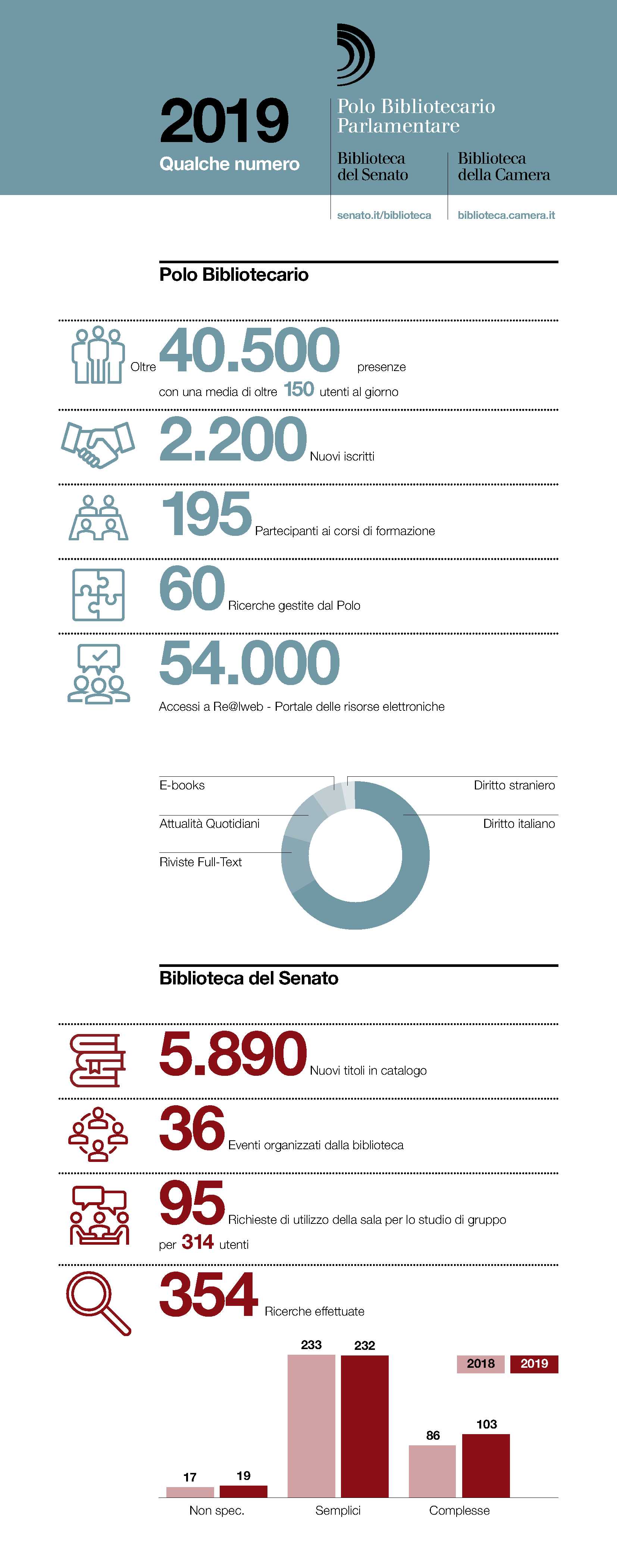 Per una visione di insieme del 2019 si può fare riferimento alla rappresentazione grafica e visuale dei dati del Polo bibliotecario parlamentare e della Biblioteca del Senato contenuta nell'infografica scaricabile anche dall'home page della Biblioteca.