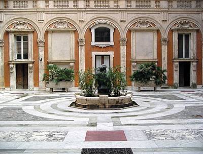 Il portale principale di Palazzo Madama conduce al Cortile d'onore, di forma rettangolare e di impronta architettonica rinascimentale. Durante i lavori di sistemazione del palazzo, portati a compimento da Paolo Marucelli a metà del '600, venne rispettato l'impianto originario; le sei colonne che lo compongono costituiscono infatti una testimonianza dell'edificio dei tempi di Leone X. Sotto il colonnato una targa commemora i lavori di restauro eseguiti sotto il pontificato di Clemente XIII, successore di Benedetto XIV, che acquistò il palazzo nel 1755 per ospitare gli uffici per lo Stato della Chiesa. Negli anni successivi trovarono inoltre collocazione, tra gli altri, gli uffici del tribunale e la sede della polizia papale. Da quì, l'origine del termine dialettale "La Madama", utilizzato ancora oggi a Roma per identificare le forze dell'ordine. La statua di Emilio Greco, che è al centro del cortile, fu posta nel 1972. A ridosso del cortile appoggiava la chiesa di San Salvatore in Thermis, del VI secolo, che tra la fine dell'800 e i primi decenni del '900 fu prima chiusa, poi espropriata e successivamente abbattuta per consentire il completamento del palazzo verso piazza S. Luigi dei Francesi. La chiesa era stata chiusa nel 1894 perché, a seguito di un attentato dinamitardo alla Camera, la polizia aveva ritenuto che gli attentatori potessero servirsene quale "appoggio" per analoga azione contro il Senato. A sinistra del portico si apre lo scalone d'onore. Fu ricostruito da Marucelli, almeno per un tratto, sulla traccia di quello del 1509. L'antico pavimento di travertino è stato sostituito da un altro in marmo. Il magnifico pavimento è decorato da marmi policromi, mentre lungo il perimetro sono esposti sarcofagi lapidei di epoca romana. Dal Cortile, l'accesso principale a Palazzo Madama, dove dipinti, affresci, arazzi, fregi, sculture e arredi settecenteschi conducono i visitatori attraverso la storia e l'arte italiana.