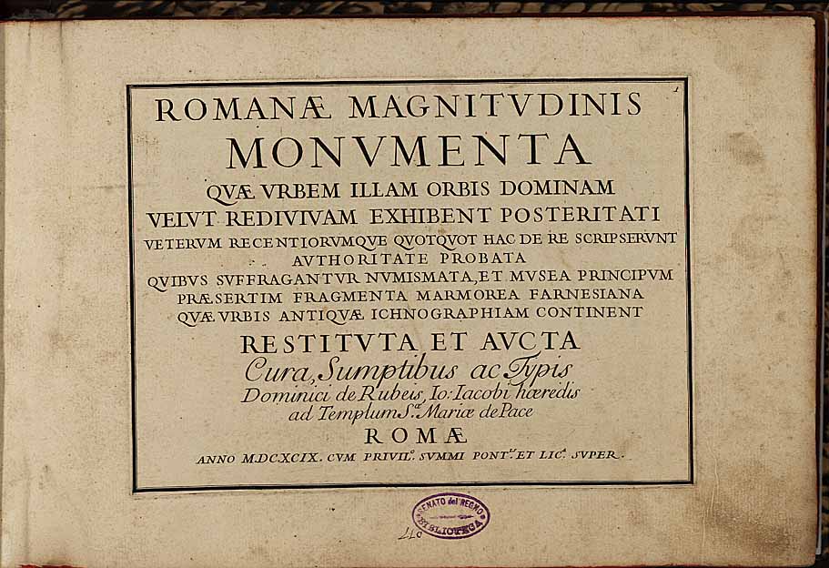 | TITOLO: | Romanae magnitudinis monumenta quae vrbem illam orbis dominam velut rediuiuam exhibent posteritati veterum recentiorumque quotquot hac de re scripserunt authoritate probata quibus suffragantur numismata, et musea principum praesertim fragmenta marmorea Farnesiana quae vrbis antiquae ichnographiam continent. Restituta et aucta cura, sumptibus ac typis Dominici de Rubeis, Io. Iacobi haeredis ad templum S.ae Mariae de Pace |